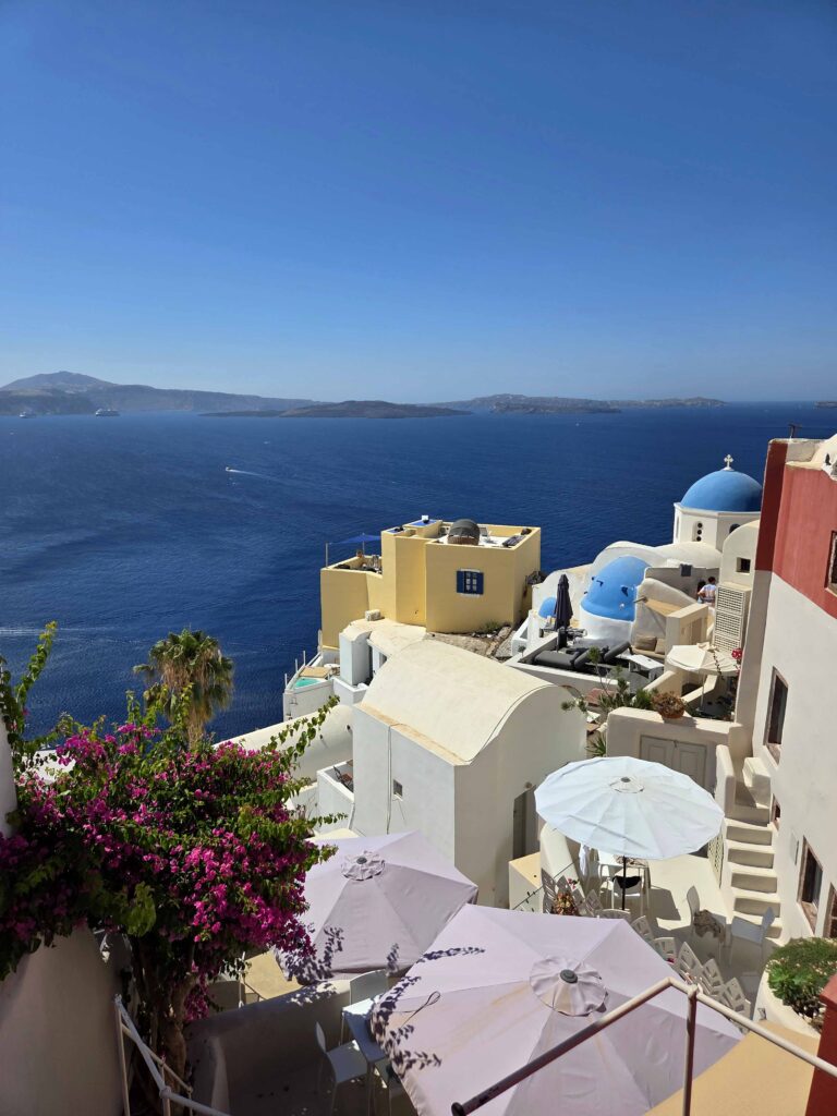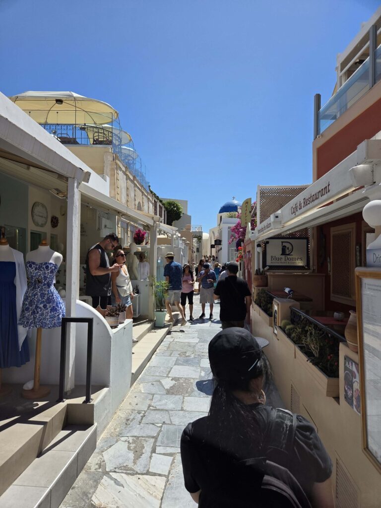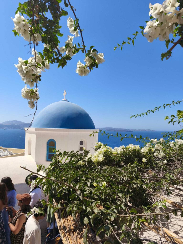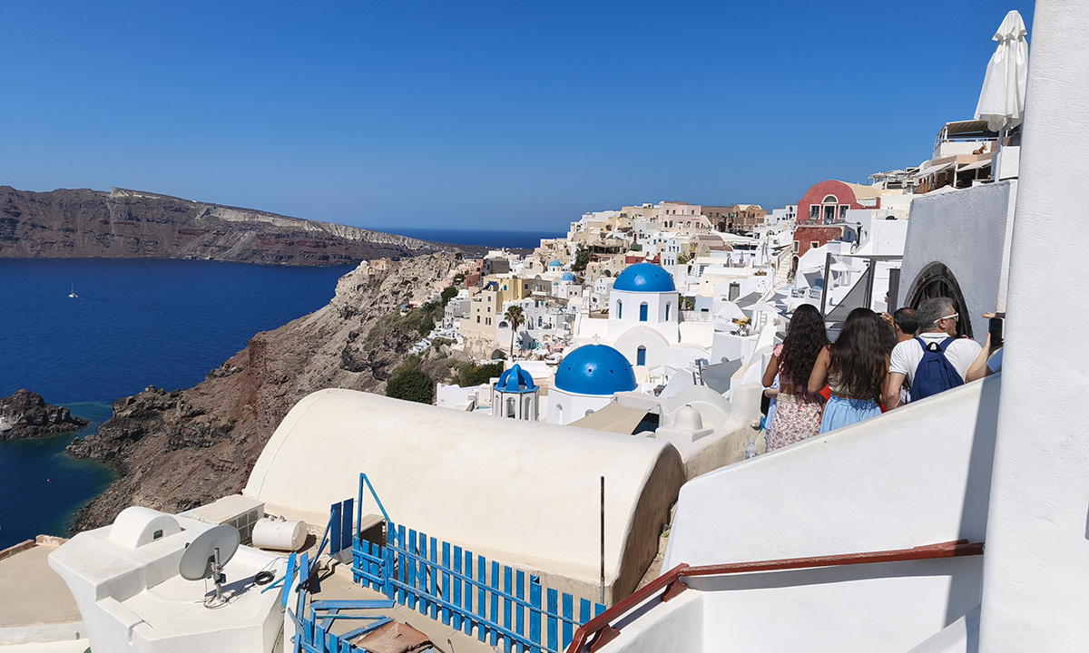 A medida que uno asciende (ya sea por el teleférico, caminando o incluso en burro) el contraste entre el azul intenso del mar y el blanco cegador de las construcciones va ganando protagonismo. La excursión los llevó directo a Oia, el poblado más pintoresco, donde las iglesias con cúpulas azules definen la silueta de la isla.