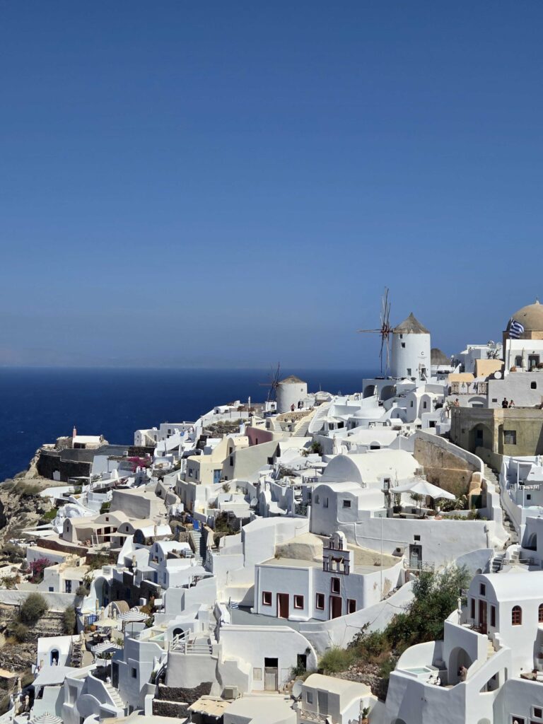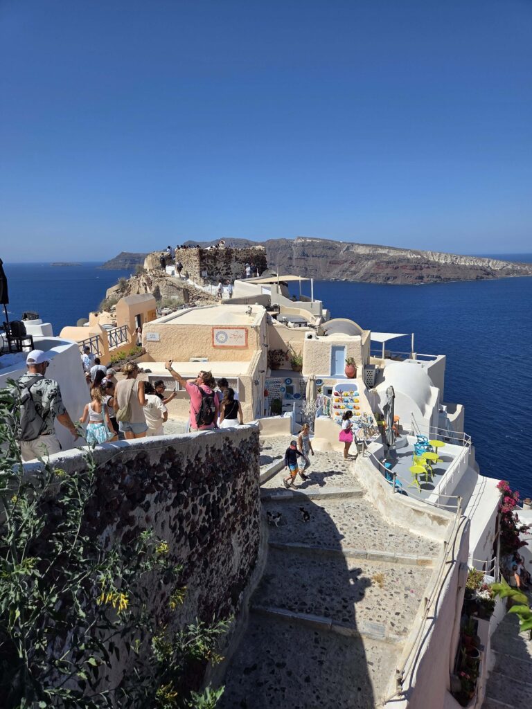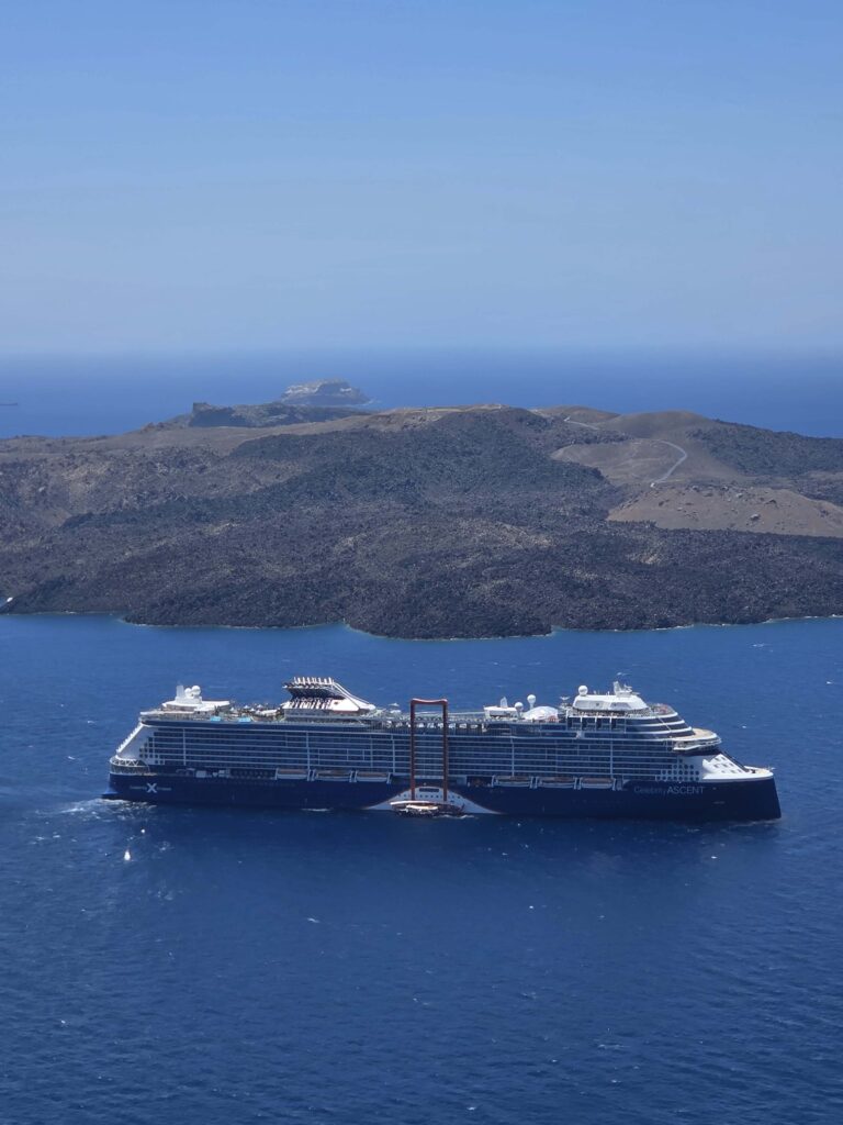 La llegada a Santorini no es una escena cualquiera. El barco ancla en la caldera, justo frente al volcán activo, y desde allí comienza el ascenso por los acantilados. “Todo ese acantilado conocido con los pueblos colgando allá arriba es la postal que uno va a ver cuando explora estos lugares. Cada rincón es para una foto. Es instagrameable”, contó Zamora.