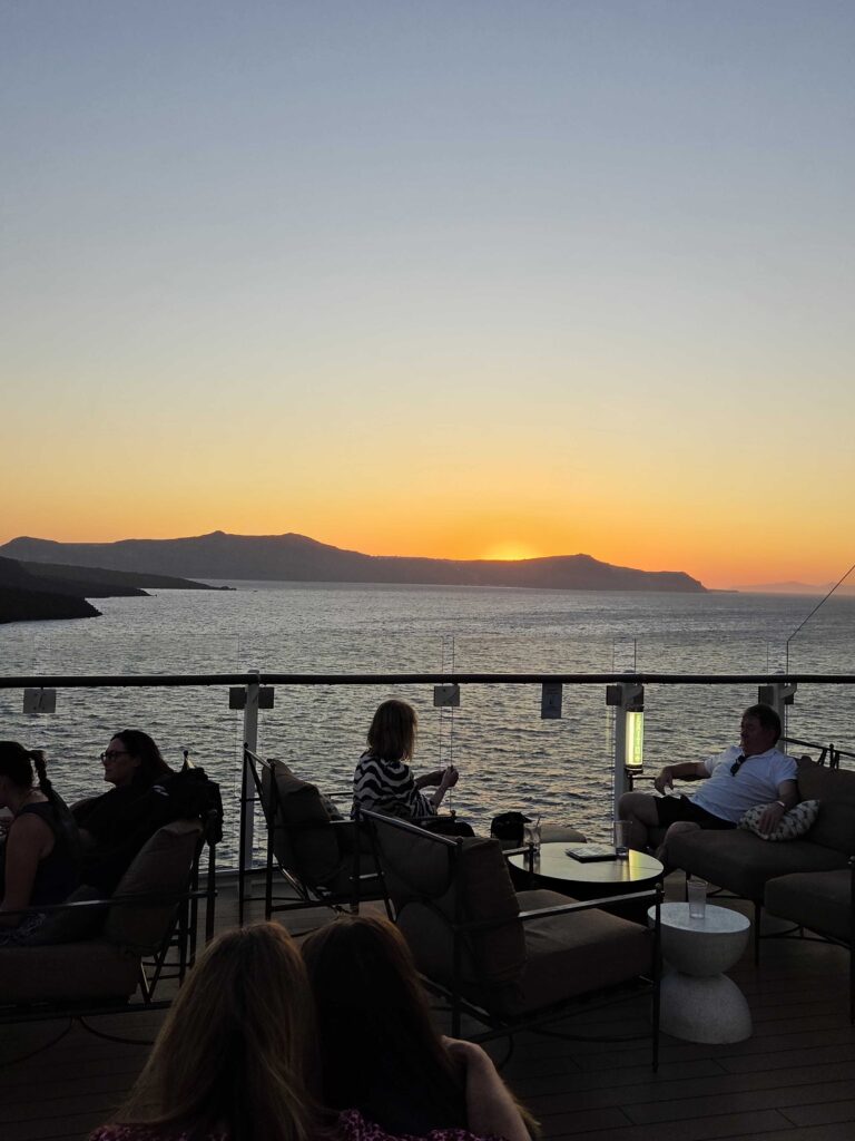 Hacia el final de la jornada, lograron ver uno de los espectáculos naturales más buscados por quienes visitan Santorini. “Pudimos disfrutar del atardecer desde el barco. Obviamente, y atrás teníamos a Fira. El atardecer desde el barco fue impresionante”, dijo y agregó que «es la gran estrella del verano, como todas las islas griegas».