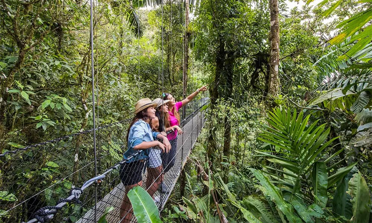 La aventura continúa en Monteverde, en el corazón del bosque nuboso. Allí se vive una de las experiencias más icónicas del país: puentes colgantes, teleférico panorámico y tirolesas.